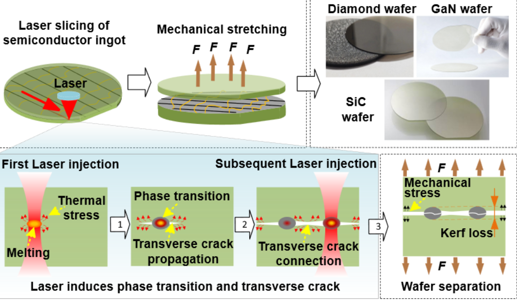以碳化硅(SiC)、氮化镓(GaN)和金刚石为代表的第三/四代半导体具有高热导率、宽禁带等优异特性,已成为新能源汽车、智能电网等战略性产业的关键材料。在半导体器件成本中,晶圆衬底加工占比高达47%。这些材料的超高硬度与脆性导致传统机械切片面临材料损耗大(>40%)、效率低及机械损伤严重等问题,成为制约晶圆制造产业升级的关键瓶颈。激光切片技术为硬脆材料提供了非接触、高精度的新型加工方案,有望将材料损耗降低至10%以下。然而,该技术中激光与材料耦合引发相变并控制裂纹定向扩展的共性物理机制仍未突破,使得工艺优化长期依赖试错和经验,限制了新一代半导体晶圆制造水平的提升。